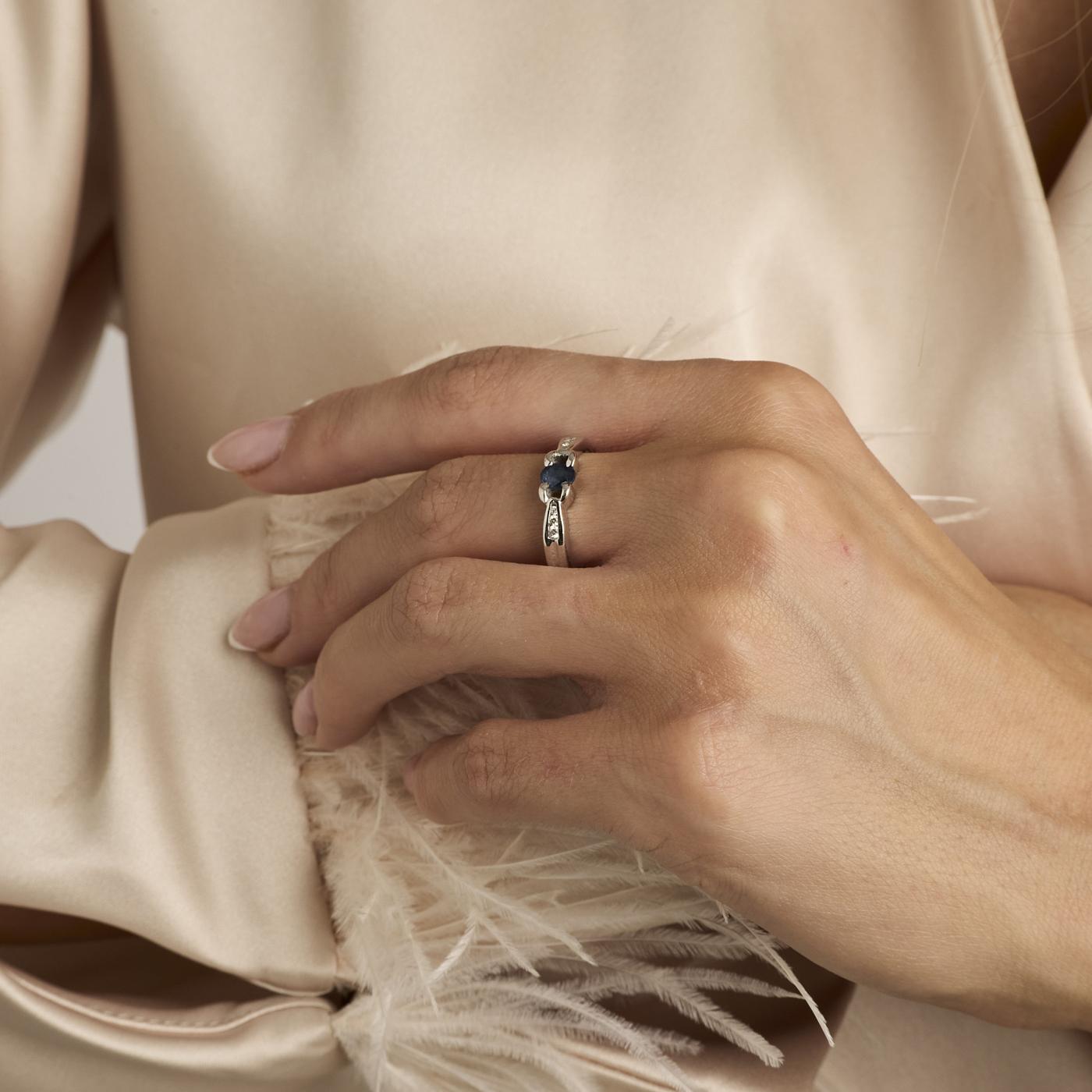 Modell: Solitairring med diamant (0.02 ct) i 18 karat med en blå topas str. 60