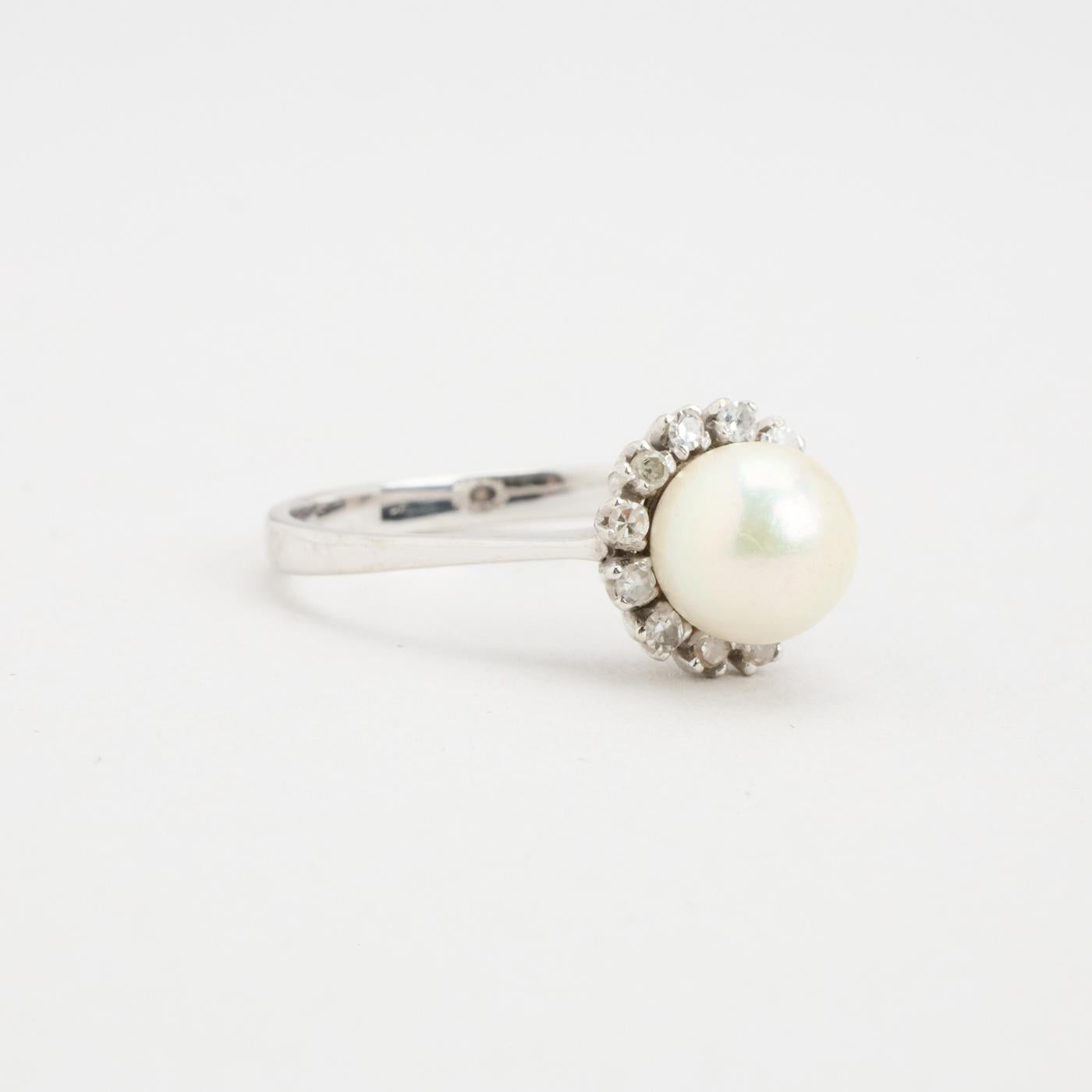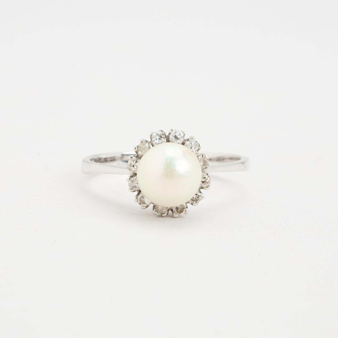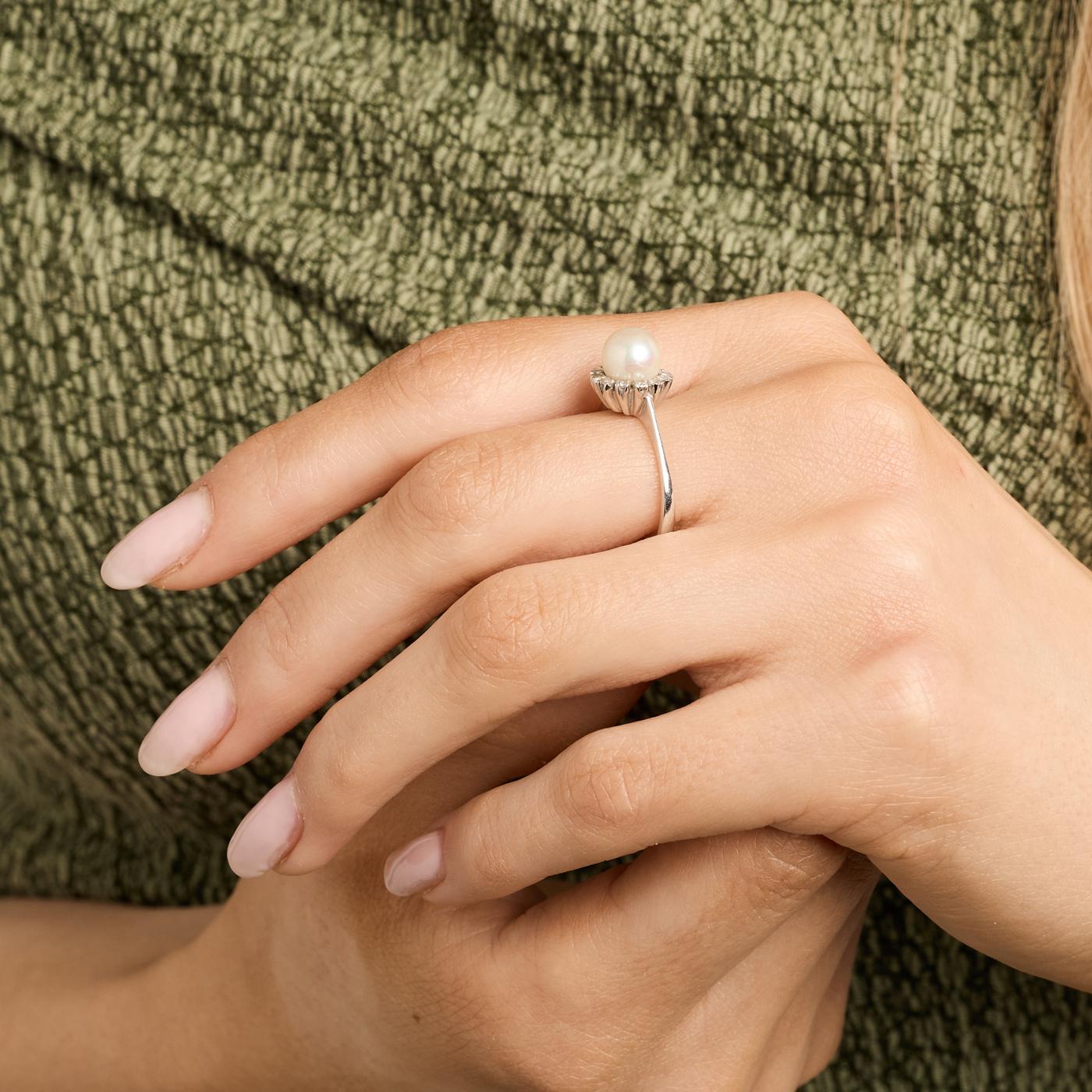 Modell: Rosettring med diamant (0.13 ct) i 14 karat med en perle str. 57