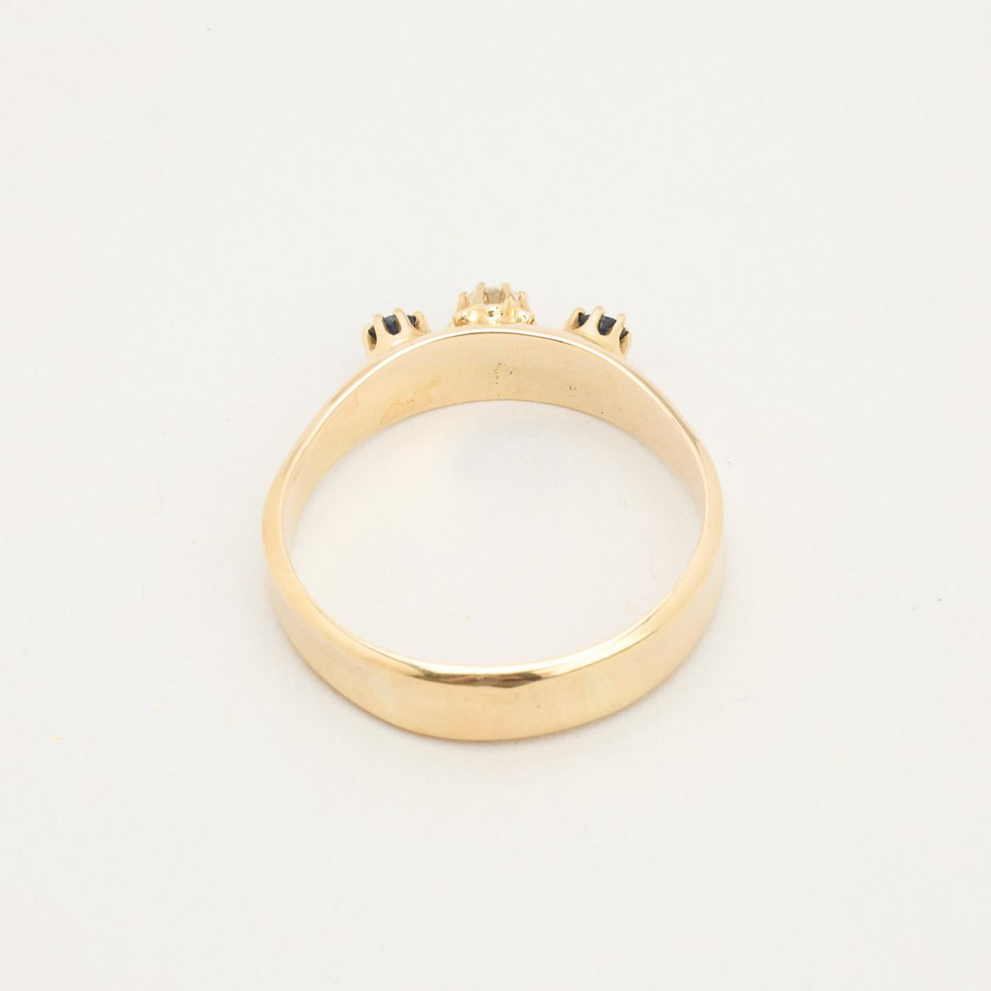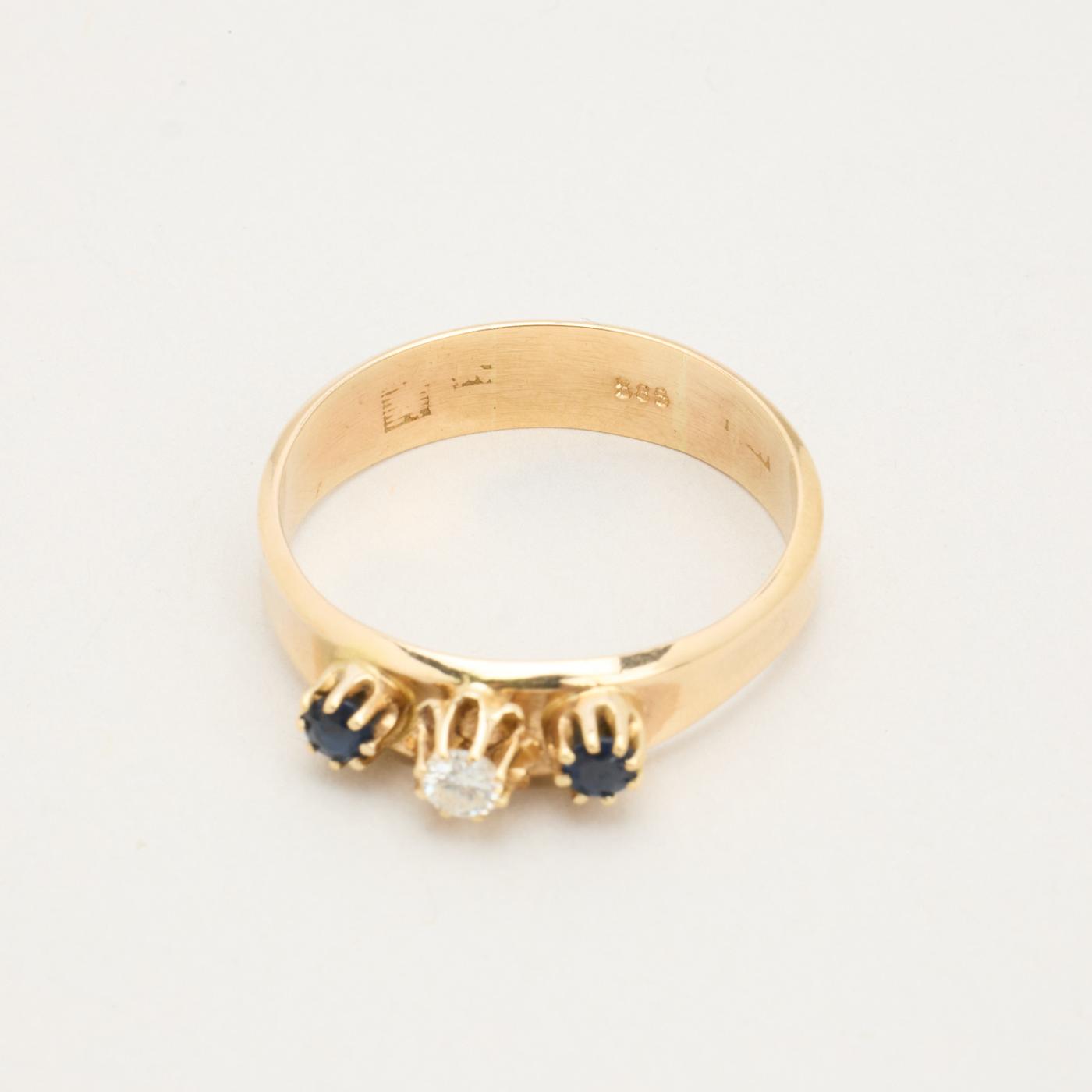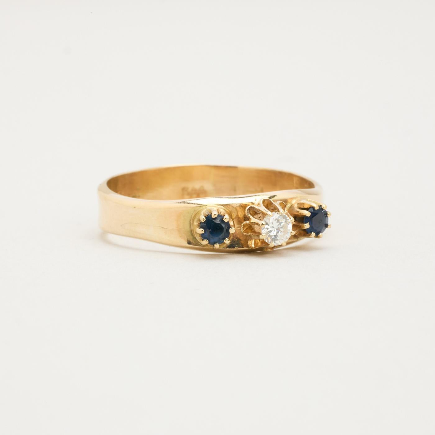 Tre stein ring med diamant (0.16 ct) i 14 karat med en safir str. 64