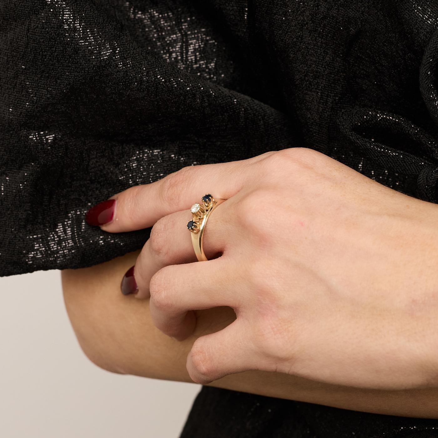 Modell: Tre stein ring med diamant (0.16 ct) i 14 karat med en safir str. 64