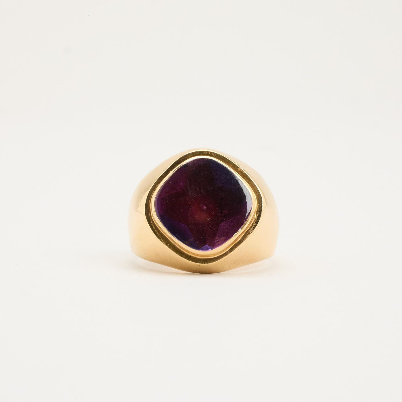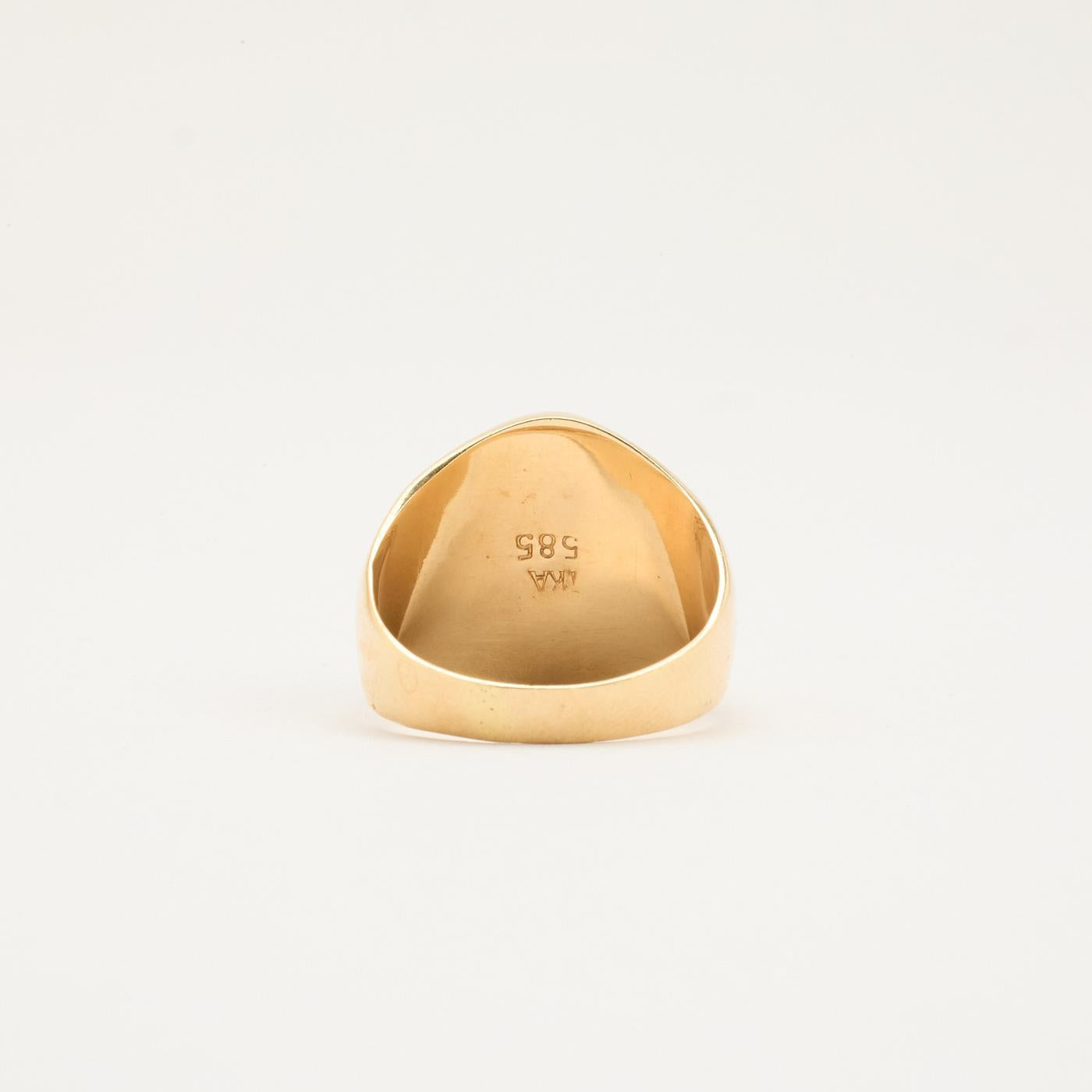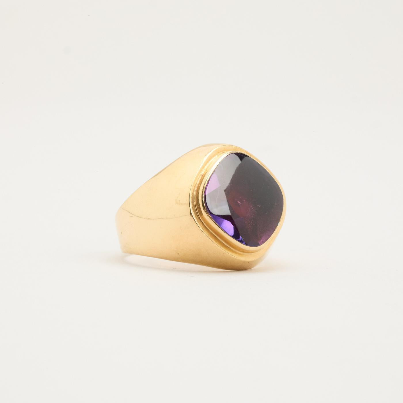 Modell: Signaturring i 14 karat med en syntetisk safir str. 58