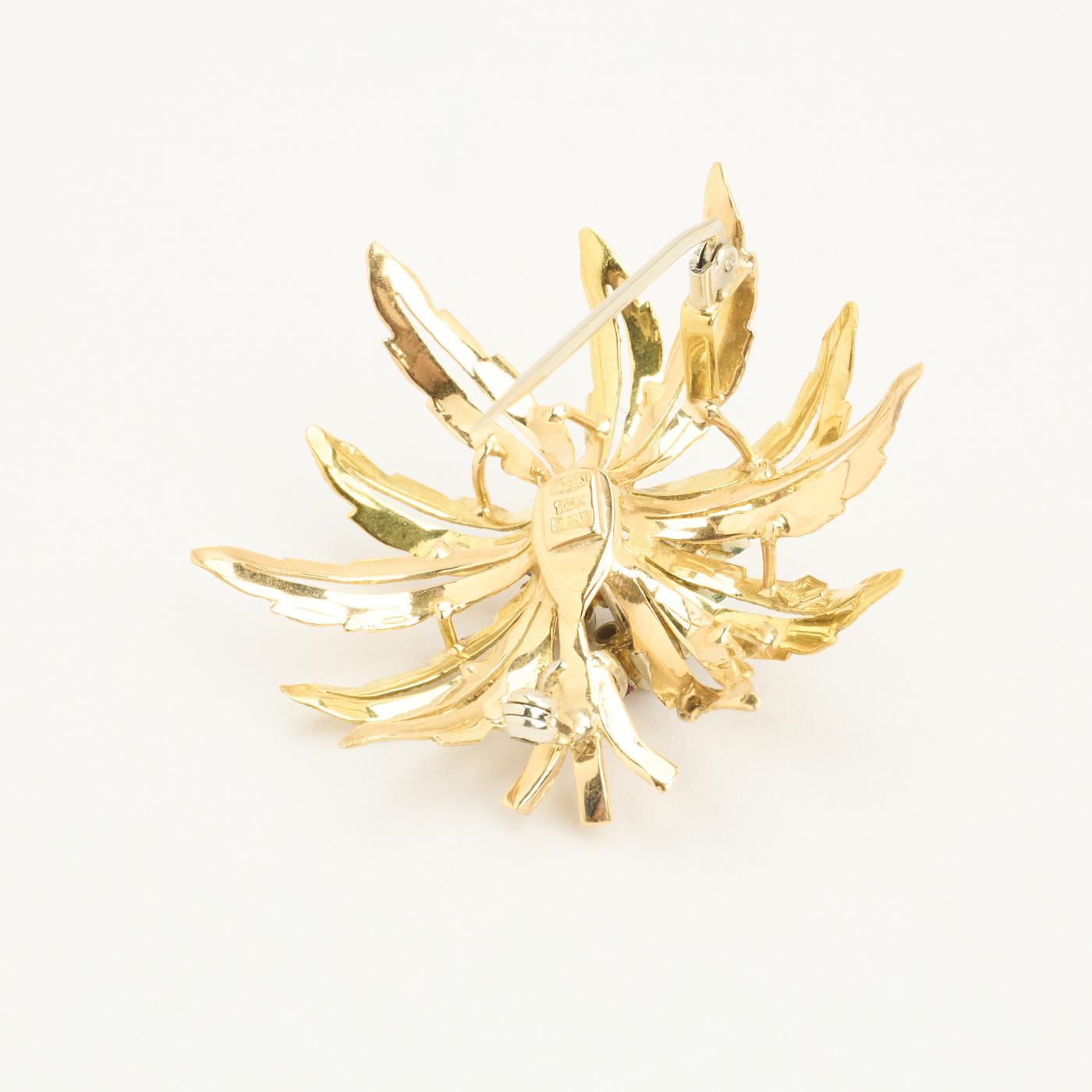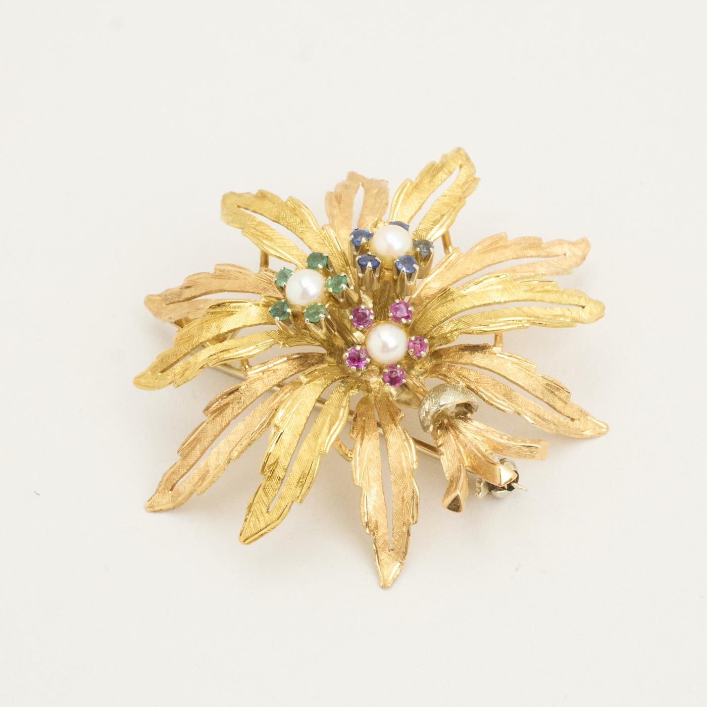 Brosje i 18 karat med en perle, rubin, safir och smaragd, 4.8 cm