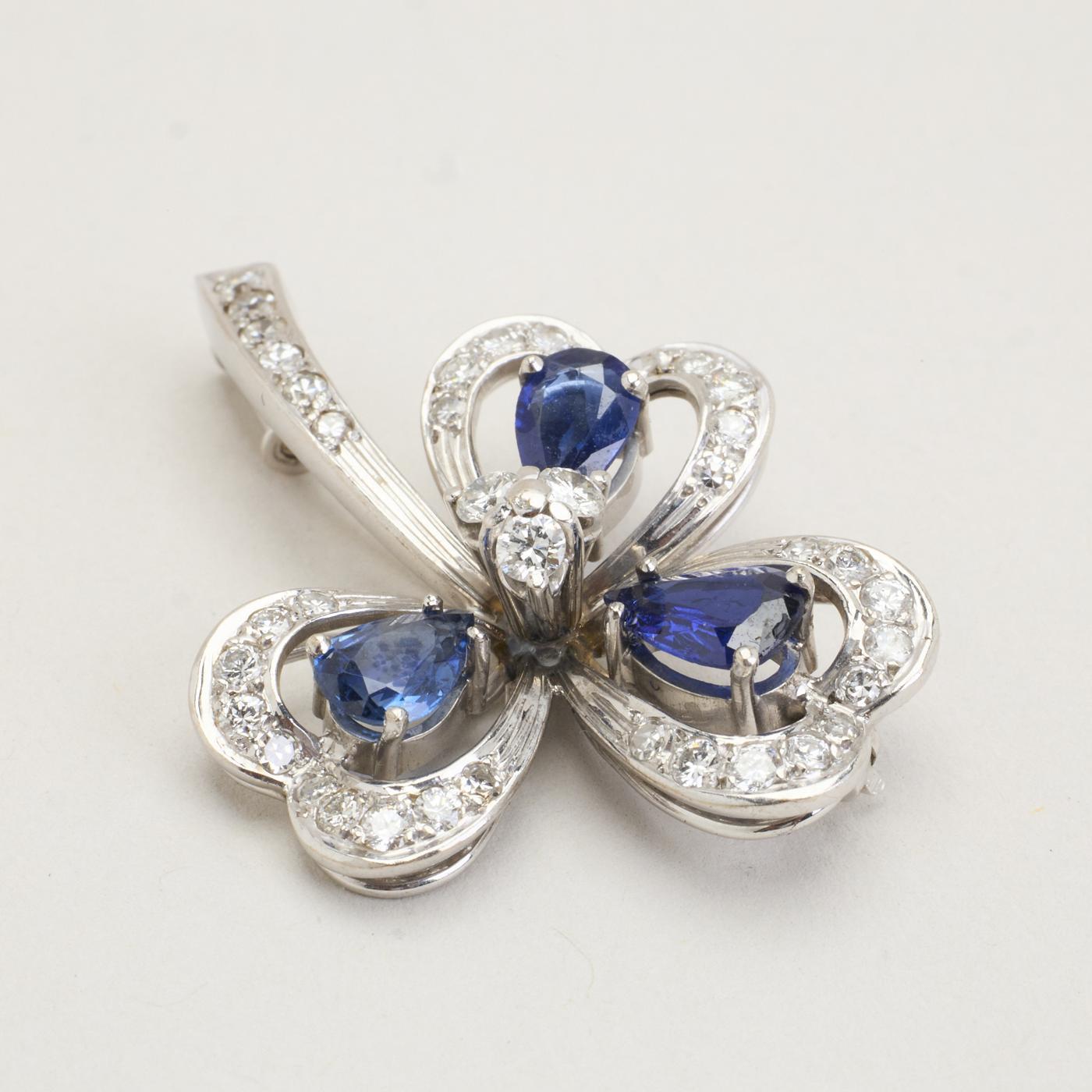 Brosje med diamant (0.74 ct) i 18 karat med en safir, 3.5 cm